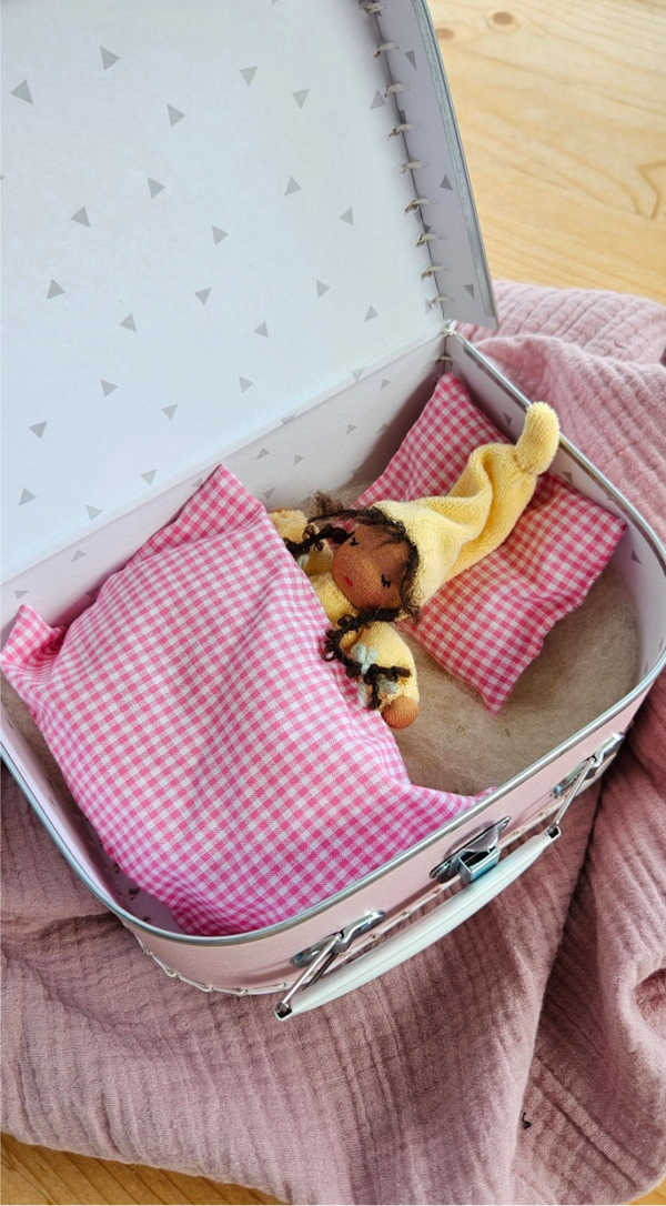 Breng een stukje zachtheid en geborgenheid in huis met dit liefdevol handgemaakte zonnekindpopje. Dit kleine Waldorf geïnspireerde popje van ca. 12 cm ligt heerlijk te rusten onder een warm wollen dekentje, veilig opgeborgen in een schattig koffertje van 20 cm.